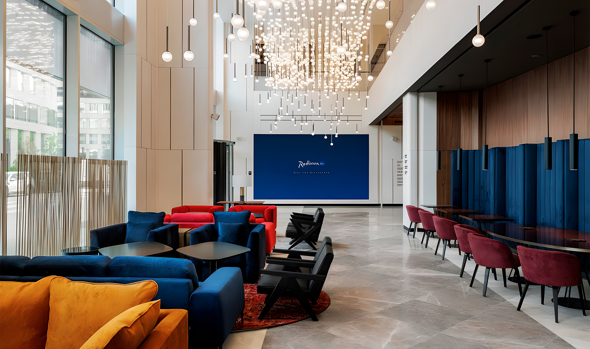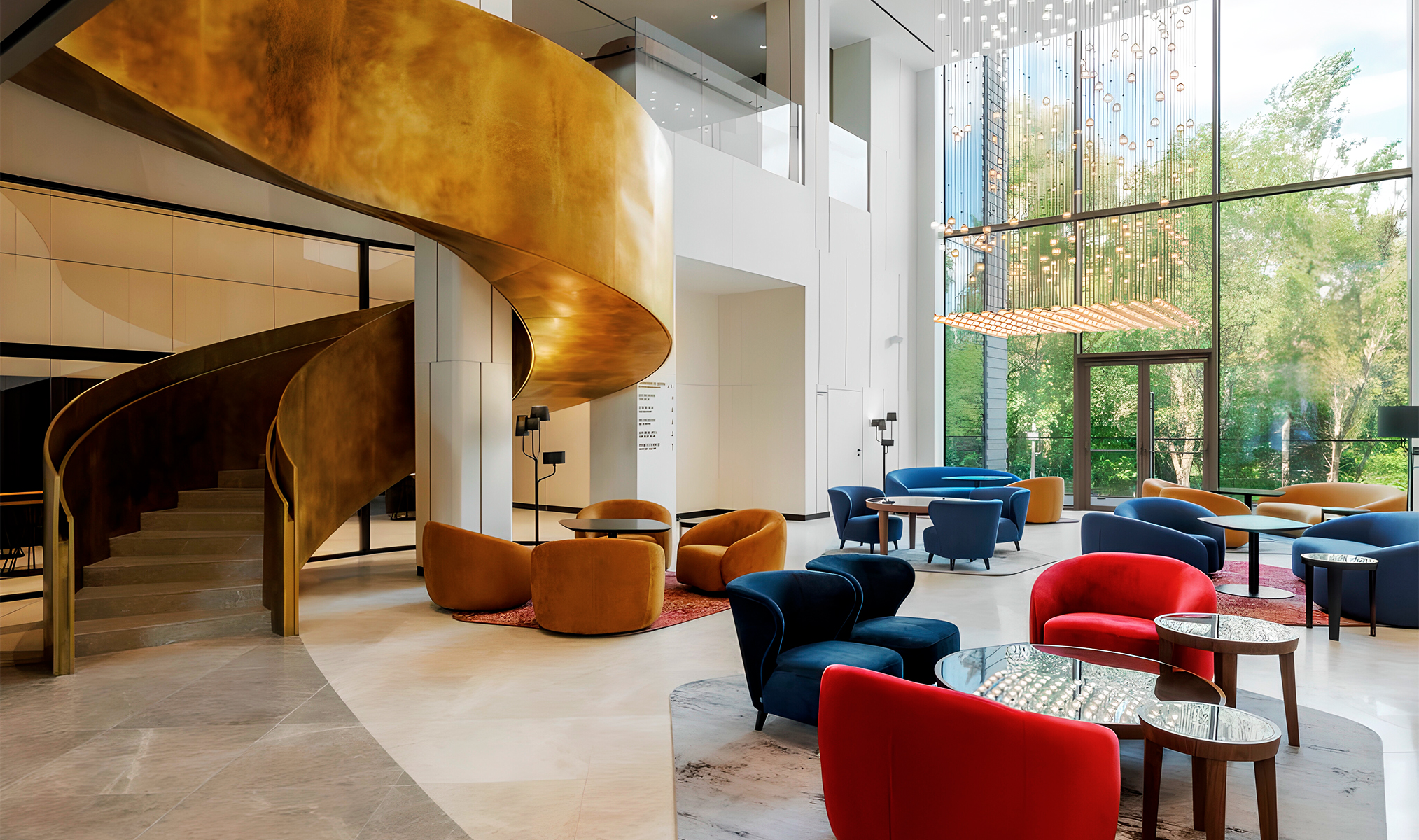 Современное восьмиэтажное здание появилось на месте советской гостиницы «Спорт». В фойе внимание сразу привлекает необычный дизайн люстр в виде лун, золотая лестница и разноцветная мягкая мебель в припыленной палитре.