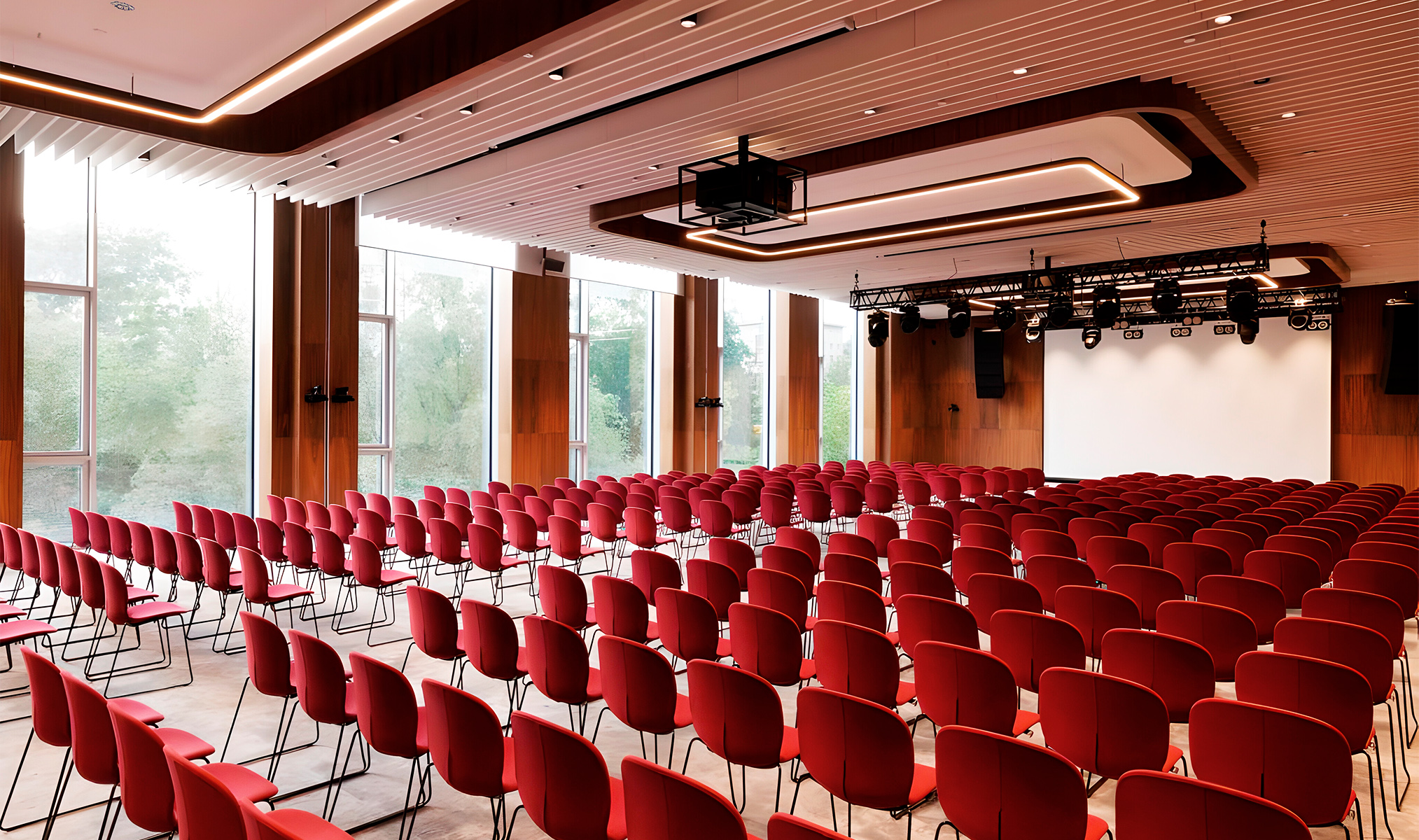 В каждом зале — LED-экран, аудиовизуально оборудование, зарядные устройства и кофемашина для восполнения энергии.