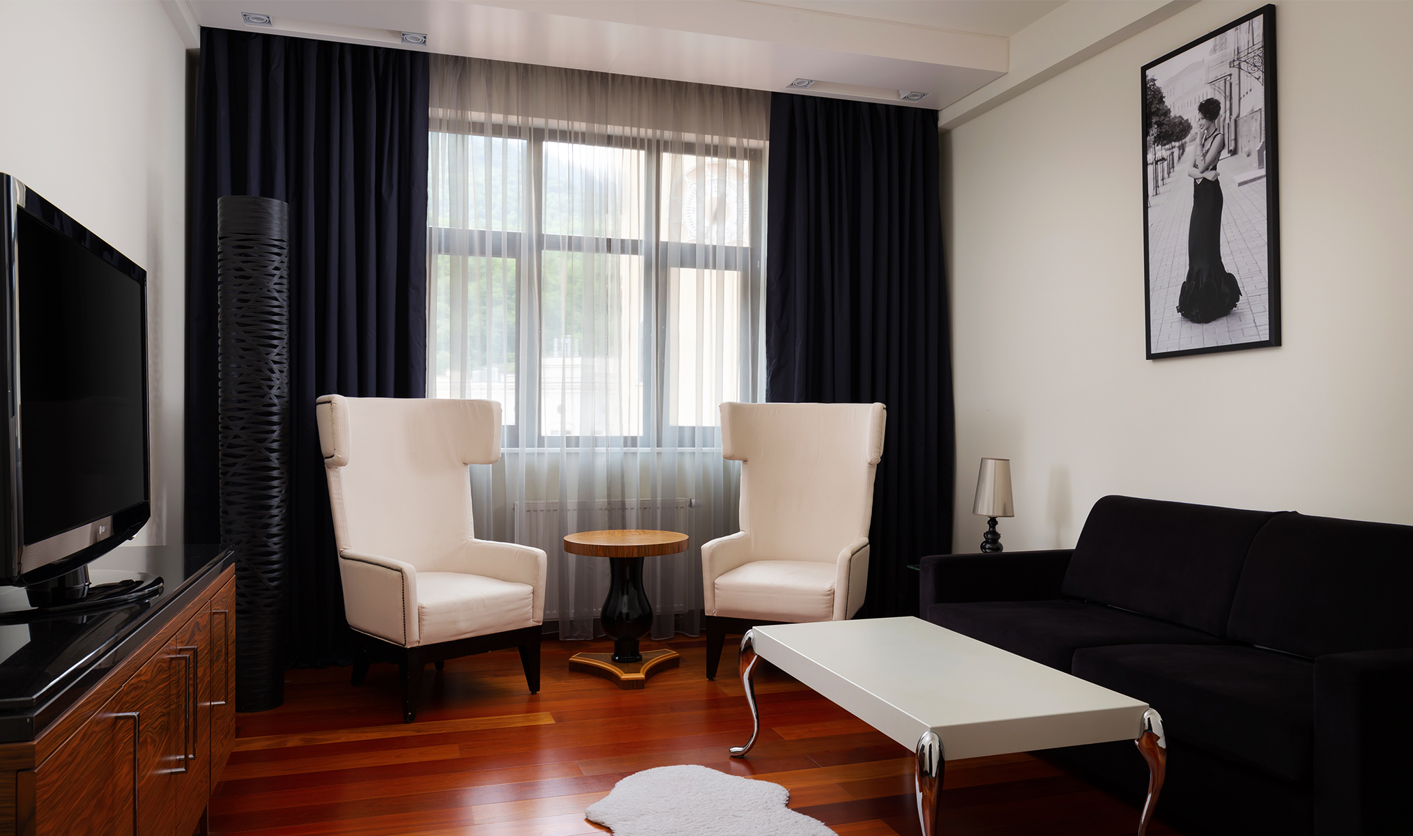 - Люксы Junior с отдельными спальной и гостиной зонами — прекрасный вариант для тех, кто планирует длительное проживание. Также в этой категории есть номера с балконами с видом на площадь. Гостям предоставляются раздельные спальная и гостиная зоны, а из окон открывается чудесный вид на Кавказские горы.