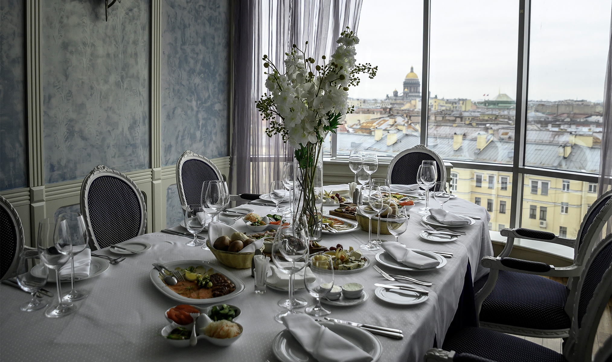 Завтрак в формате шведского стола с игристым подают в ресторане «Панорамный» на 9 этаже с видом на Исаакиевский собор.