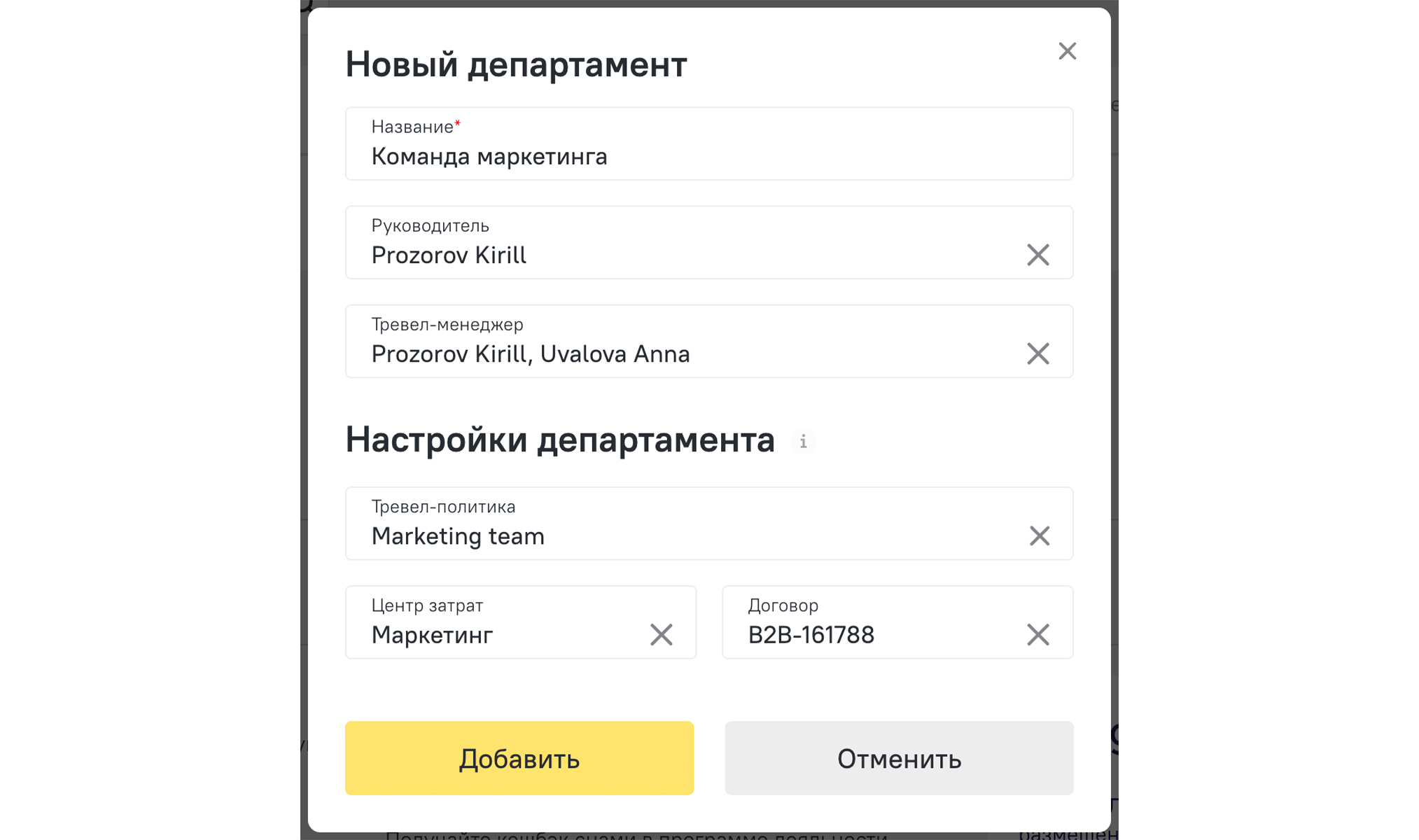 - Настройте общие правила для всех членов департамента (центр затрат, тревел-политика, договор).