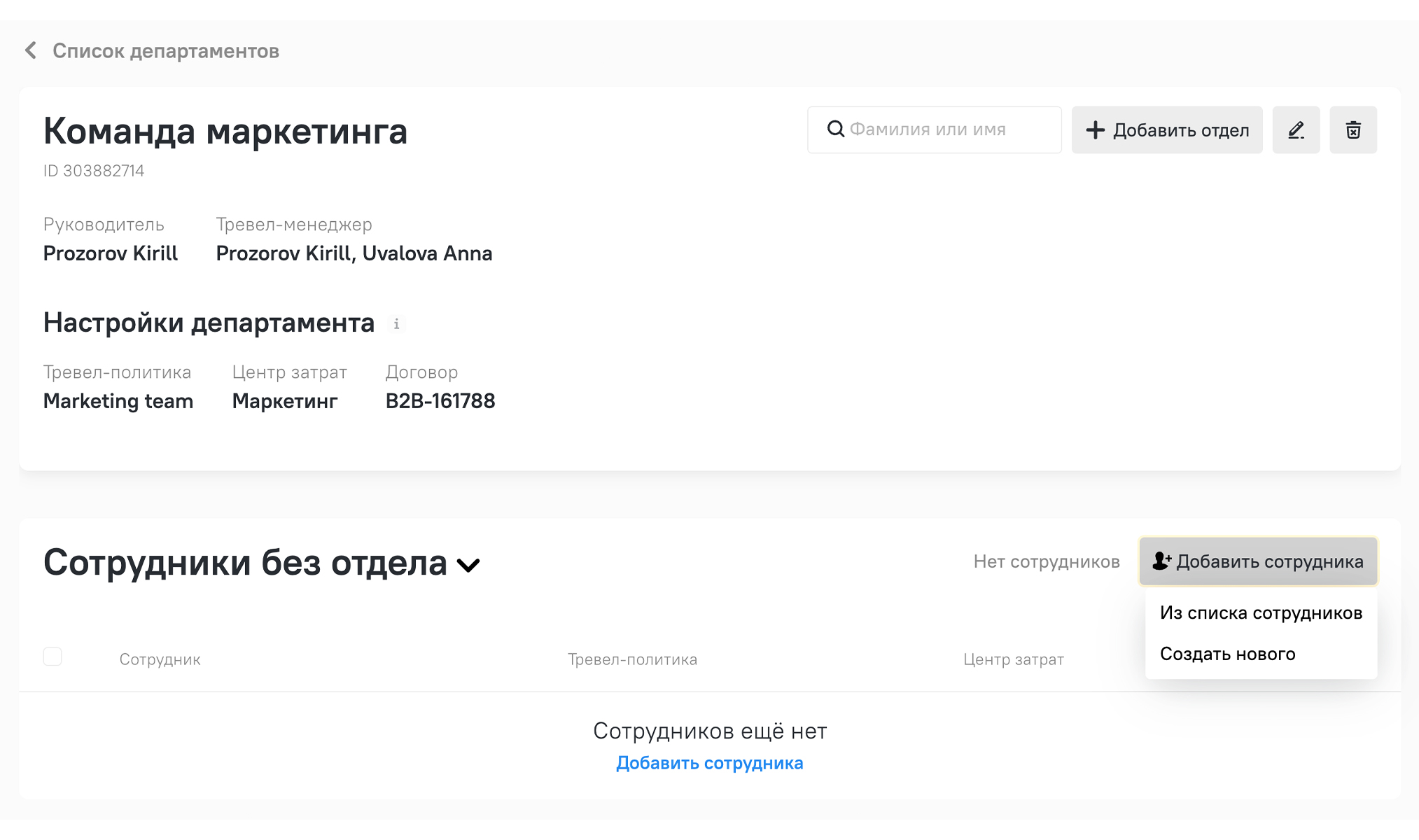 - Можно указать личного тревел-менеджера для каждого департамента. При этом он сможет бронировать тревел-услуги только для своей группы и не увидит другие.