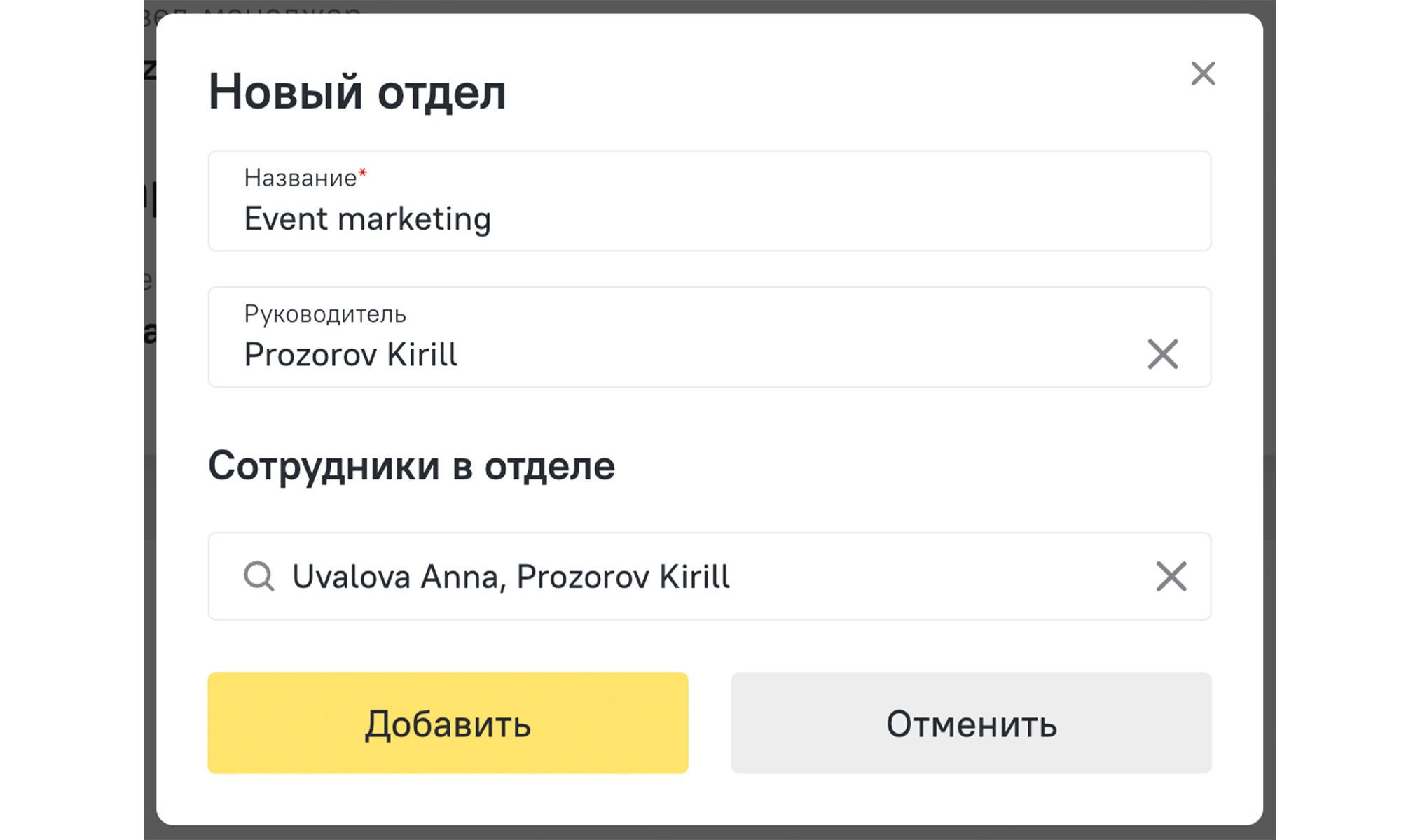 Внутри департамента для вашего удобства можно создать ещё одну группу — «Отдел». Автоматически она перенимает настройки своего департамента. Создать новый отдел можно с помощью кнопки в правом верхнем углу в карточке департамента.