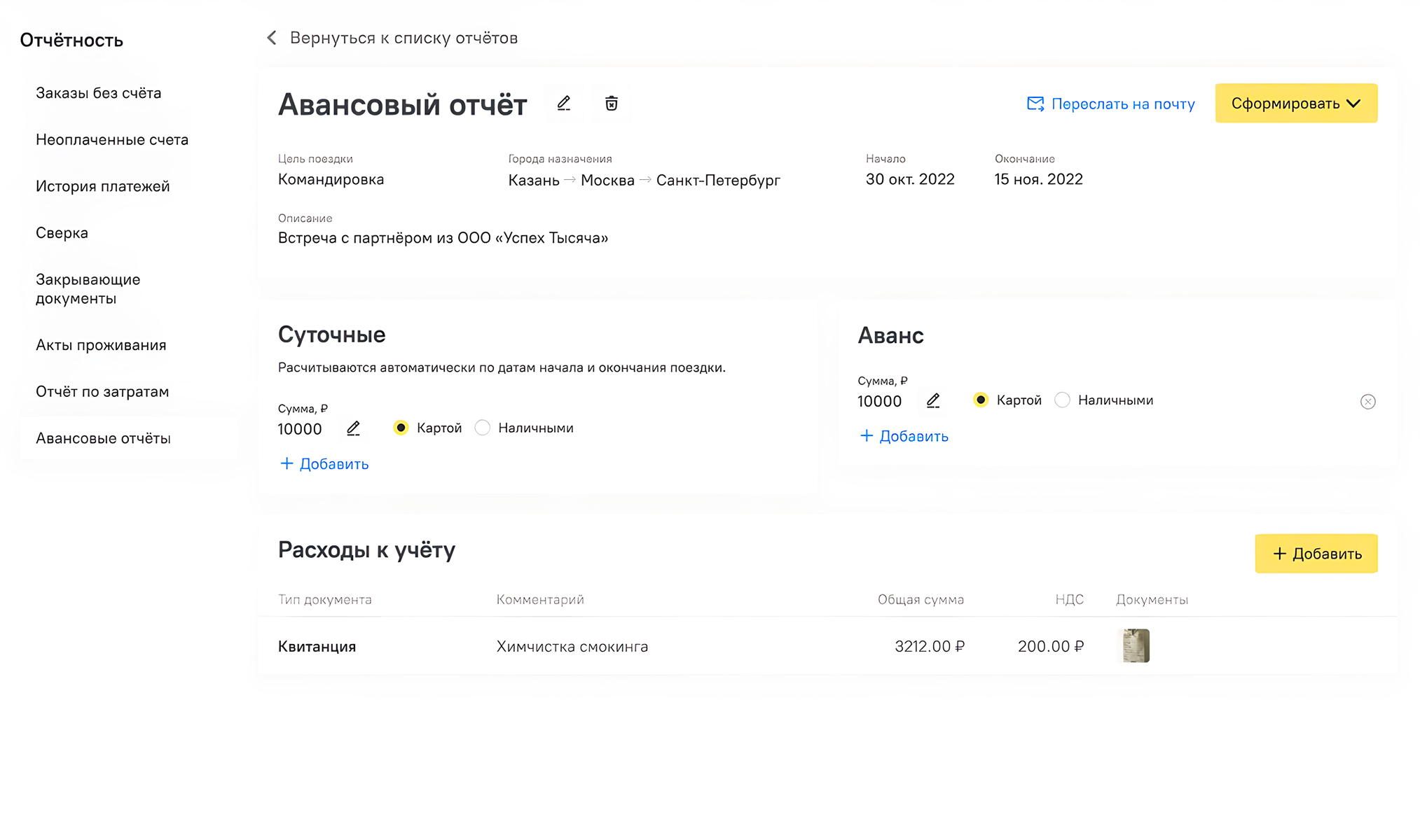 - Отчёт для бухгалтерии: «Сформировать» → «Авансовые отчёты».