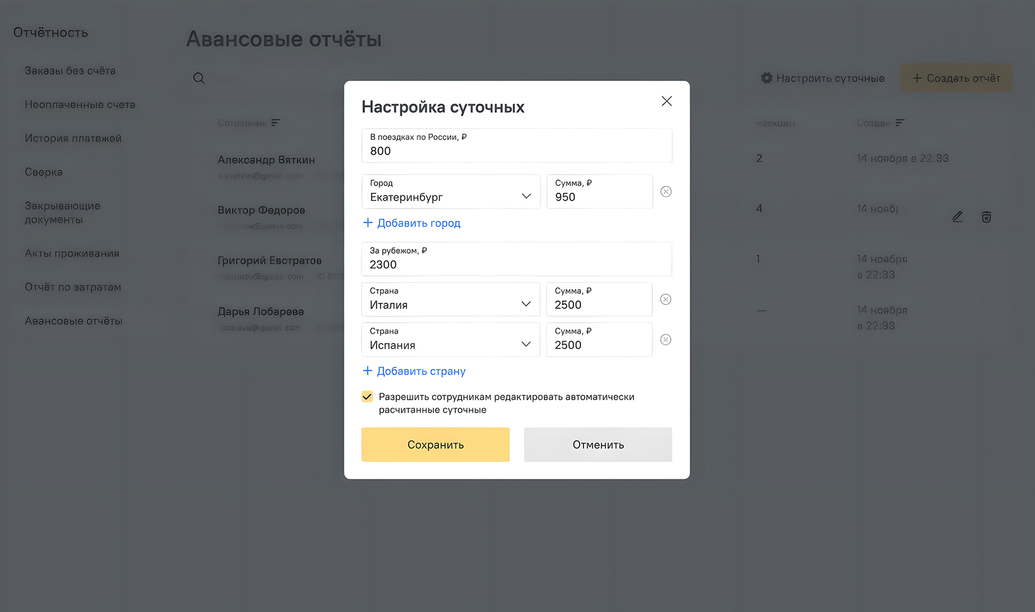 В «Авансовых отчётах» можно настроить суточные, назначить индивидуальные суммы авансов и указать дополнительные расходы по поездке.
