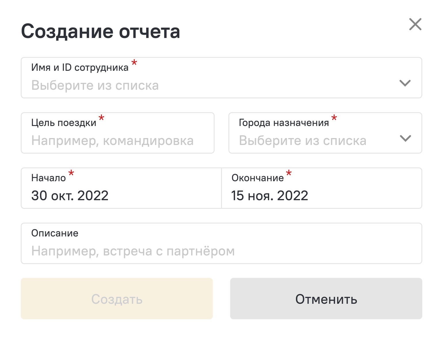 - Нажмите «Создать отчёт» и заполните данные о поездке.