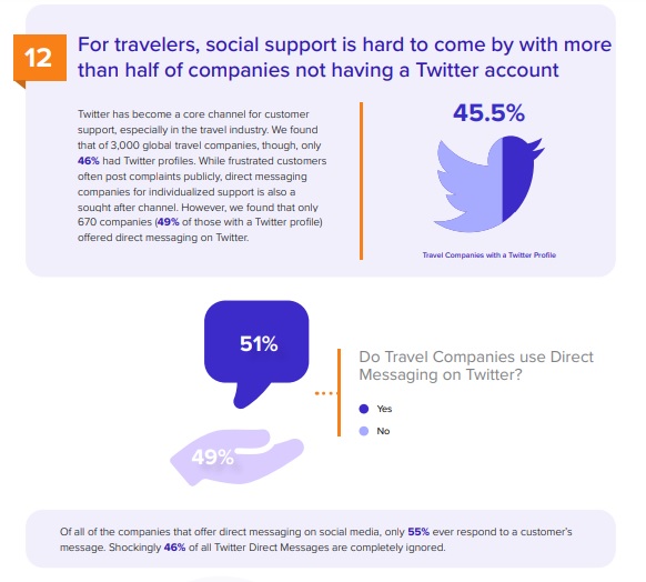 Говоря о присутствии компаний в Twitter, только 46% из 3000 компаний в принципе ведут аккаунт в социальной сети. В целом же 46% сообщений от путешественников не получают обратной связи.