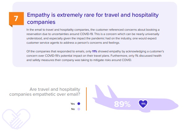 Более того, из компаний, которые ответили на электронные письма, только 11% проявили сочувствие, разделив озабоченность клиентов по поводу потенциального влияния COVID-19 на их планы, и только 1% среди всех компаний, ответивших на электронные письма, обсудили меры по охране здоровья и технике безопасности, которые принимаются для снижения рисков, связанных с COVID-19.