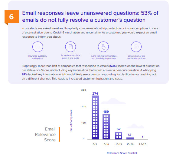 Аналитики хотели узнать, предоставляют ли компании информацию с правилами отмены или изменения поездки, с доступностью и вариантами страхования и другими уточняющими фактами. Удивительно, но более половины компаний, ответивших на электронные письма (53%), не включили в ответ ключевую информацию, которая могла бы помочь пользователю.