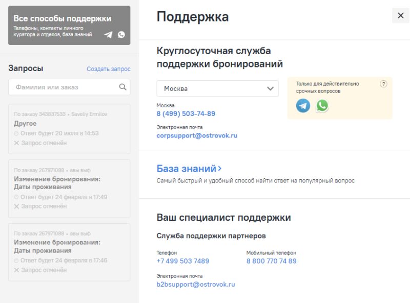 Помимо этого, вы всегда можете написать на электронную почту corpsupport@ostrovok.ru или позвонить по номерам 8 800 770 7489, +7 499 503 7489.